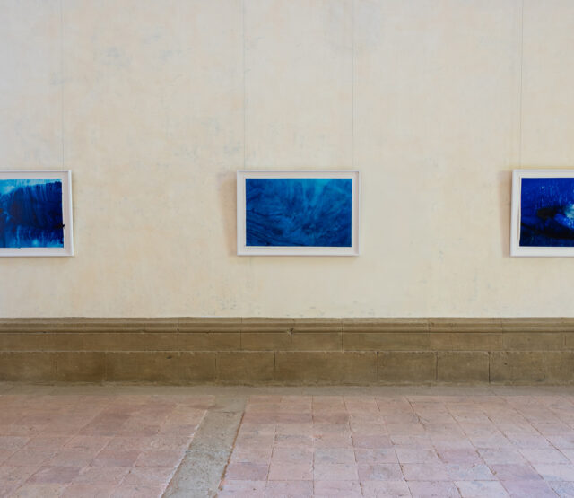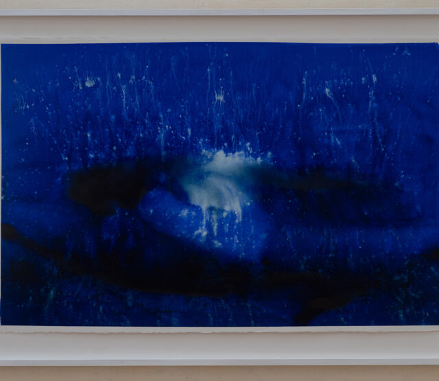 Le opere su carta di Alex Cecchetti evocano visioni sottomarine e meditative, suggerite forse dalle innumerevoli immersioni in apnea dell’artista, e create tramite un processo di immersione in acqua, limone e minerali. Le superfici assorbono colori e forme, dando vita a immagini ipnotiche e organiche che sembrano ritratti dell’oceano interiore, oscillando tra quiete e agitazione.